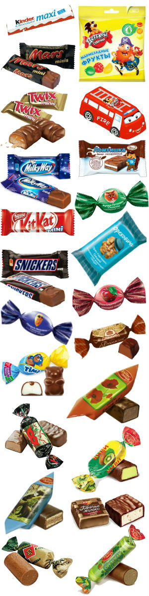 Бисквитный десерт "Ломтишка" (1 шт), Конфеты "Орешка" (1 шт), Конфеты "Фитси" (1 шт), Конфеты "Прохлада" (1 шт), Конфеты "Батончик Акконд" (1 шт)
