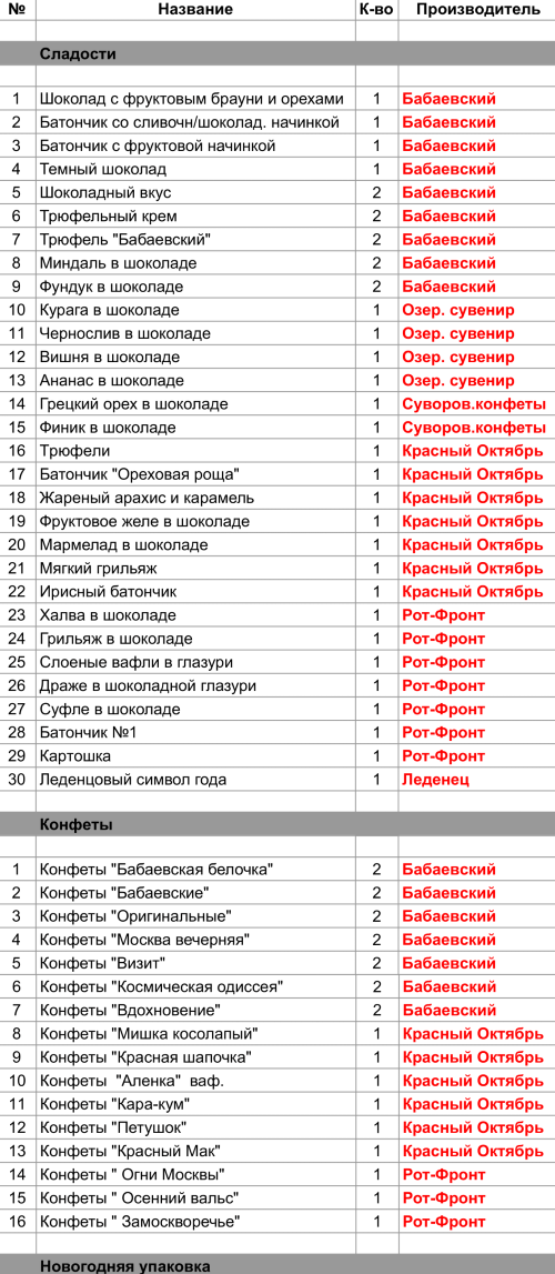 Трюфели (1 шт),Батончик "Ореховая роща" (1 шт),Жареный арахис и карамель (1 шт),Фруктовое желе в шоколаде (1 шт),Мармелад в шоколаде (1 шт),Мягкий грильяж (1 шт),Ирисный батончик (1 шт),Конфеты "Мишка косолапый" (1 шт),Конфеты "Красная шапочка" (1 шт),Конфеты  "Аленка"  ваф. (1 шт),Конфеты "Кара-кум" (1 шт),Конфеты "Петушок" (1 шт),Конфеты "Красный Мак" (1 шт)